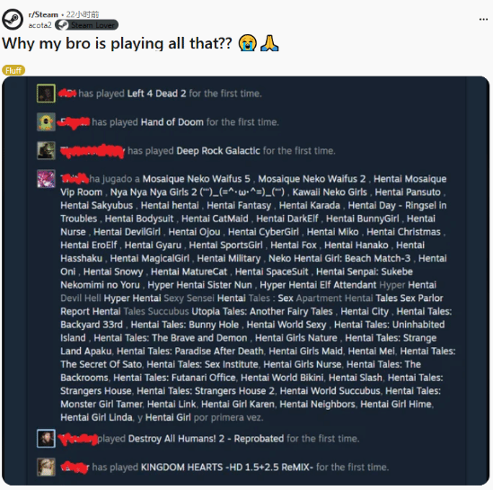近日在外網(wǎng)論壇reddit上面有一外國(guó)網(wǎng)友在steam板塊發(fā)了發(fā)自己的牢騷:“為什么我的哥哥總是在玩這些NSFW游戲!”搭配上該網(wǎng)友使用的emoji表情可以看出他確實(shí)十分絕望了。