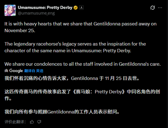 據(jù)日媒denfaminicogamer報(bào)道,日本傳奇賽馬Gentildonna(貴婦人)已于近日去世,享年16歲。這匹賽馬是游戲《賽馬娘Pretty Derby》中同名角色的原型,游戲官方已通過(guò)社交媒體表