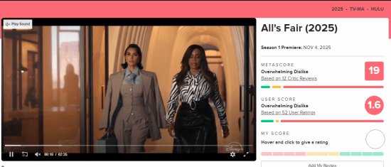 由瑞恩·墨菲創(chuàng)作,金·卡戴珊、娜奧米·沃茨、妮希·納什-貝茨、蒂安娜·泰勒、莎拉·保羅森等人主演的美國(guó)法律劇集《All's Fair》近日在Hulu首播,但收獲了評(píng)論界的一致差評(píng),評(píng)論者主要批評(píng)其劇本薄