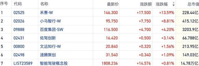 港股智駕概念股今日集體上揚,激光雷達與自動駕駛解決方案供應商成為市場焦點。截至盤中交易時段,禾賽科技(02525.HK)股價漲幅突破13%,小馬智行(02026.HK)緊隨其后上漲近9%,百度集團(09888.HK)等產業鏈相關企業同步走強,板塊整體