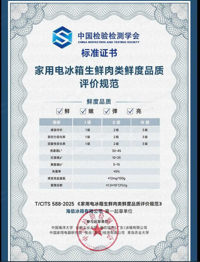 9月29日,由海信冰箱牽頭制定的《家用電冰箱生鮮肉類鮮度品質評價規范》正式通過審定。這一團體標準的建立,首次為冰箱行業的“肉類保鮮”能力構建了一套科學、完整且可量化的評價體系,標志著家用冰箱保鮮技術