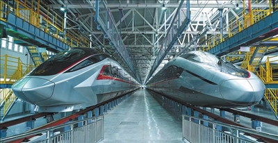 圖為兩列CR450動車組樣車停靠在湖北宜昌動車所。唐 瑩攝(人民視覺)  單列時速453公里、相對交會時速896公里,這是CR450動車組樣車近日在試驗期間跑出的最新紀錄。  記者從國鐵集團了解到,自去年底樣
