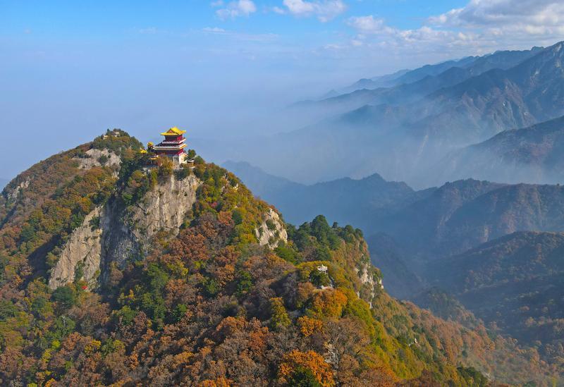 秋冬之交的南五臺景區,恰似大自然以五彩顏料暈染的絕美長卷。南五臺坐落于秦嶺終南山中段北麓,獨特的褶皺斷塊地貌讓這里的景觀層次豐富而立體。登上南五臺之巔,向遠方眺望,漫山的紅葉如熾熱云霞翻騰,黃葉似碎金肆意鋪灑,再加上錯落其中的古寺樓宇、曲折山道,共同勾勒出一幅雄渾又秀美的山水勝景。