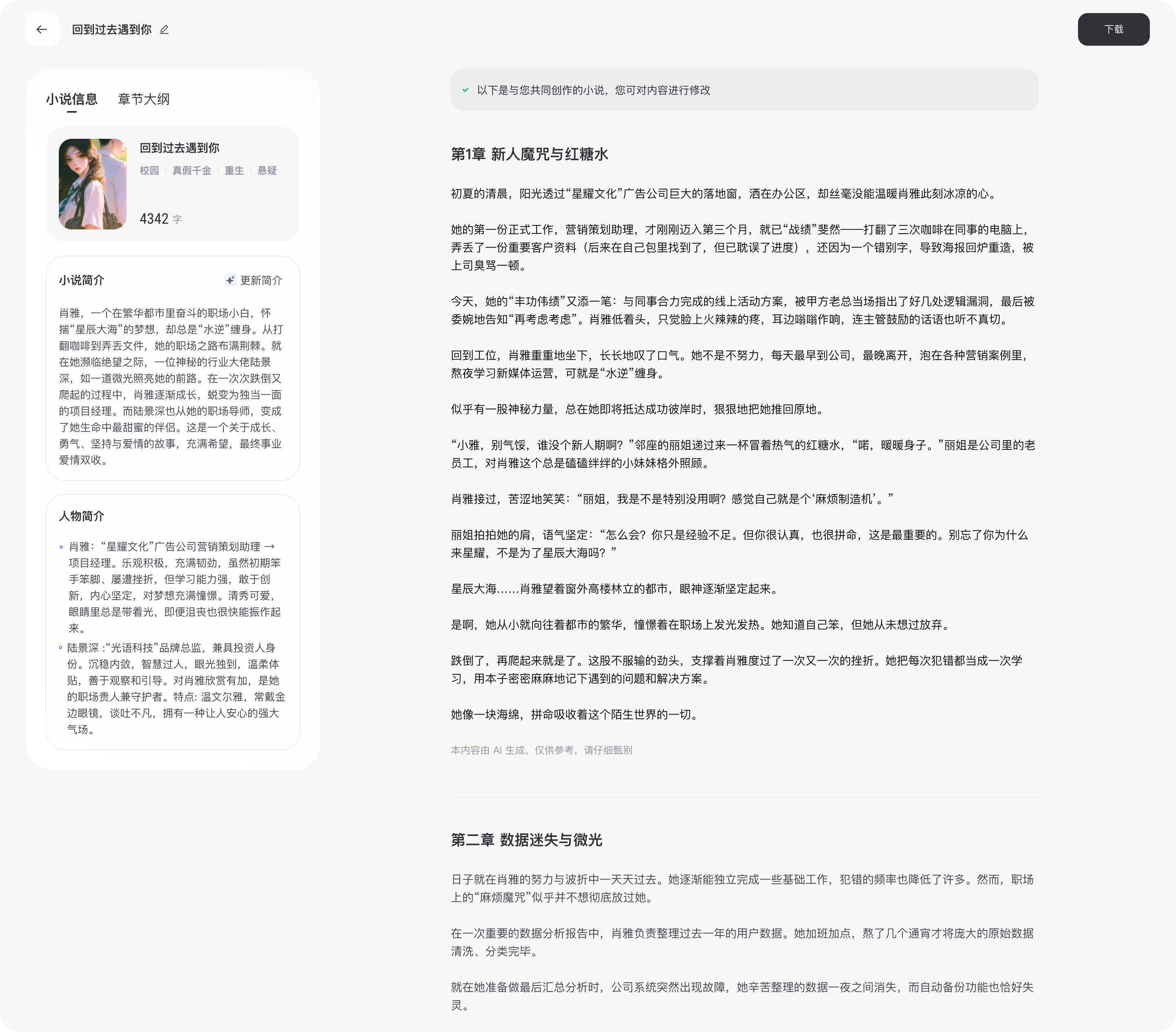 例如,用戶輸入“幫我寫一篇小說,題材為校園,角色是青梅竹馬,劇情是歡喜冤家天作之合”。系統便能生成包括世界觀設定、角色關系、主線劇情和章節內容的完整小說。
