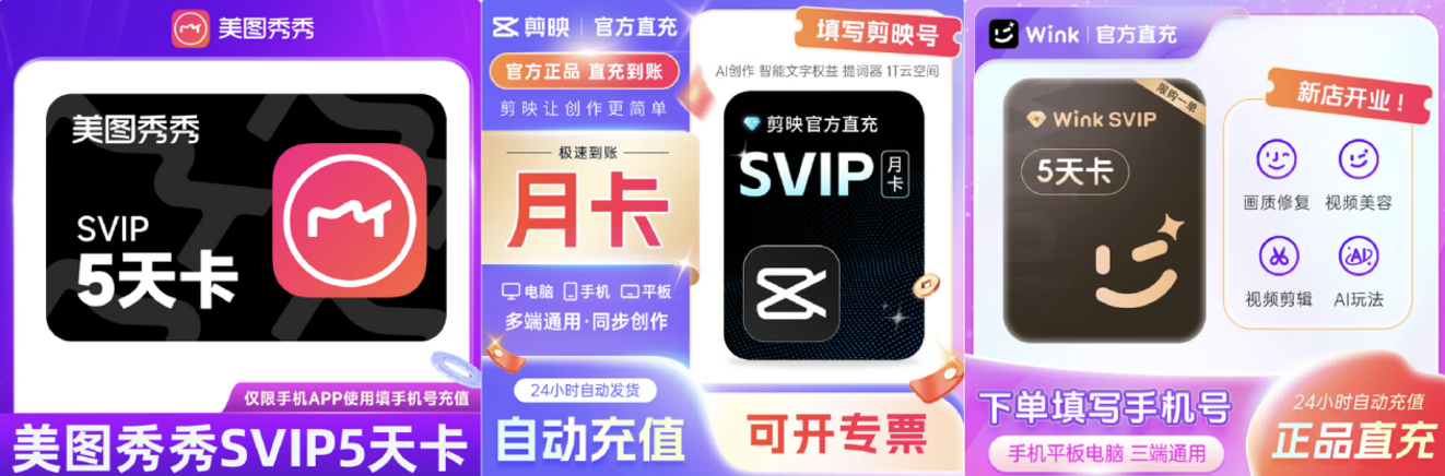 旅行途中會拍攝不少照片和視頻,如果需要修圖或剪輯成vlog后發(fā)布在社交平臺,那就可以來京東為APP充值,讓修圖、剪輯更簡單。其中,美圖秀秀SVIP 5天卡到手價11.9元,剪映SVIP月卡到手價37.9元,Wink SVIP 5天卡到手價15元。
