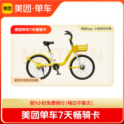 假期出行,用共享單車有時更方便。可以到京東辦理一張美團單車7天暢騎卡,每次騎行前1小時免費(每日不限次),到手價8.5元。