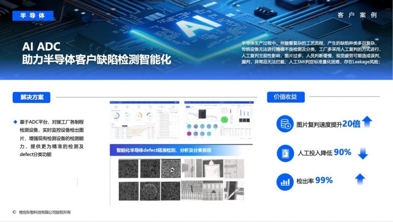 值得關(guān)注的是,公司在半導(dǎo)體、半導(dǎo)體顯示、SMT行業(yè)擁有大量的典型案例。在某半導(dǎo)體生產(chǎn)項(xiàng)目中幫助客戶降低90%的人力投入,缺陷檢出率達(dá) 99%以上。