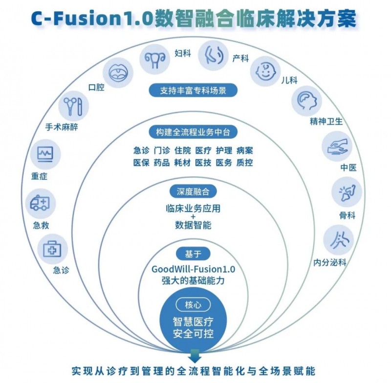 在臨床方面,重點展示基于GoodWill-Fusion平臺的數智融合臨床解決方案C-Fusion1.0,其核心特點是:智能化、專科化,助力醫院實現從診療到管理的全流程智能化與全場景專科賦能。