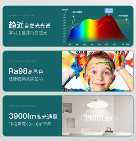 光源質量直接關系到視覺健康。優質風扇燈應配備全光譜光源,其光線均勻柔和,能減輕長時間用眼壓力。普通吸頂燈常存在光線昏暗或頻閃問題,而全光譜技術通過模擬自然光波段,從光源底層減少藍光危害與降低眩光現象。高顯色指數(如Ra98以上)進一步確保了色彩還原的真實性,尤其適合需要精準辨色的活動。