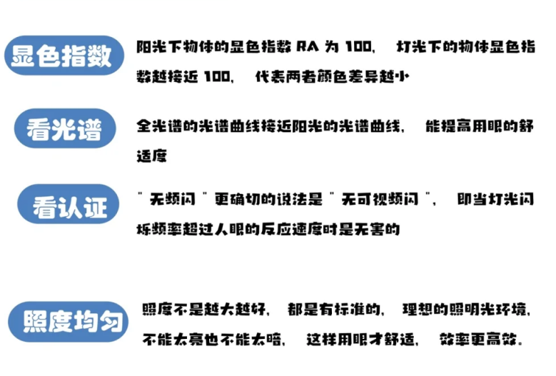在光學性能方面,該產品通過美國進口雙芯片與SMD封裝技術,雙藍光芯片實現了光譜波長的精準調配,有效補充缺失光波段。其光線無限接近太陽光,配合Ra98高顯色指數、UGR<19防眩光技術、RG0豁免級藍光標準,從光源底層保障用眼健康。