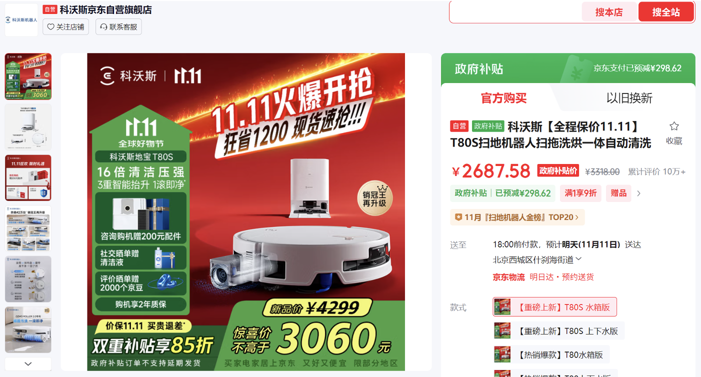 家中不止要除塵更要除污,科沃斯T80S掃地機器人能一次解決。搭載OZMO ROLLER 2.0恒壓滾筒活水洗地專利,200次/分鐘自清潔,實時刮走污水,杜絕以臟拖臟。16倍清潔強壓,干涸醬漬、奶漬一滾即凈。三重智能升降系統,自動識別干濕區與地毯,及時抬升,避免二次污染;京東11.11下單雙重補貼享85折優惠,到手價2688元。