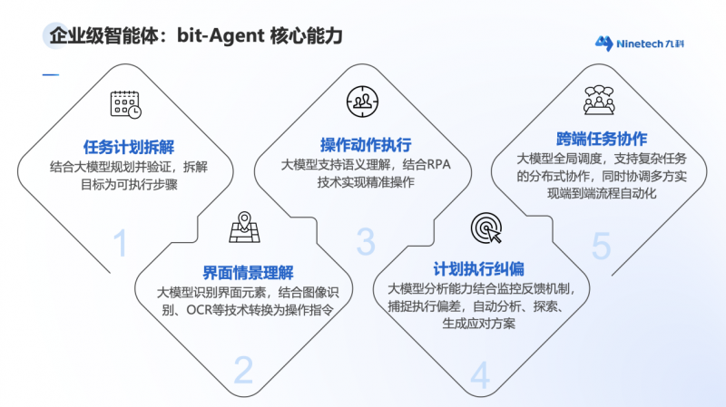其中,九科信息自主研發的bit-Agent頗具代表性。作為國內首個實現商業化落地的GUI Agent,它打通了“決策-感知-執行-學習”的全鏈路能力,讓其在制造業、金融業等領域快速構建起差異化智能體解決方案。