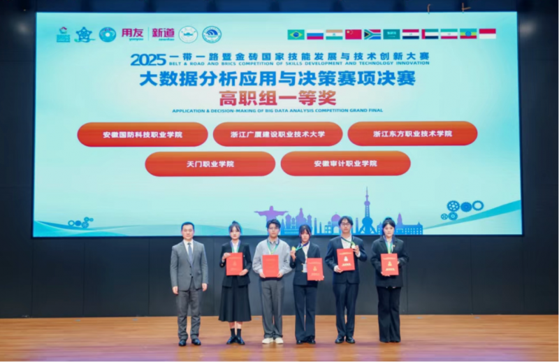11月8日-9日,2025“一帶一路”暨金磚國家技能發展與技術創新大賽大數據分析應用與決策賽項決賽成功落幕。105支參賽隊伍經過一天半的激烈角逐,河南理工大學、山東外國語職業技術大學、安徽財經大學、齊魯工業大學(菏澤校區)、武漢東湖學院、吉林工商學院(本科組),安徽國防科技職業學院、浙江廣廈建設職業技術大學、浙江東方職業技術學院、天門職業學院、安徽審計職業學院(高職組)榮獲大賽一等獎。