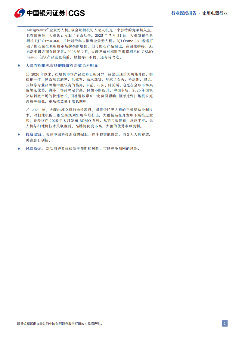 相比之下,大疆在掃地機器人市場的嘗試尚未取得突破。2025年推出的ROMO系列因技術關聯度弱、品牌協同不足,且面臨石頭科技、科沃斯等專業品牌的激烈競爭,市場份額長期徘徊在低個位數水平。這一案例反映出,科技企業的跨界擴張需以核心技術為支撐,否則難以在紅海市場中突圍。